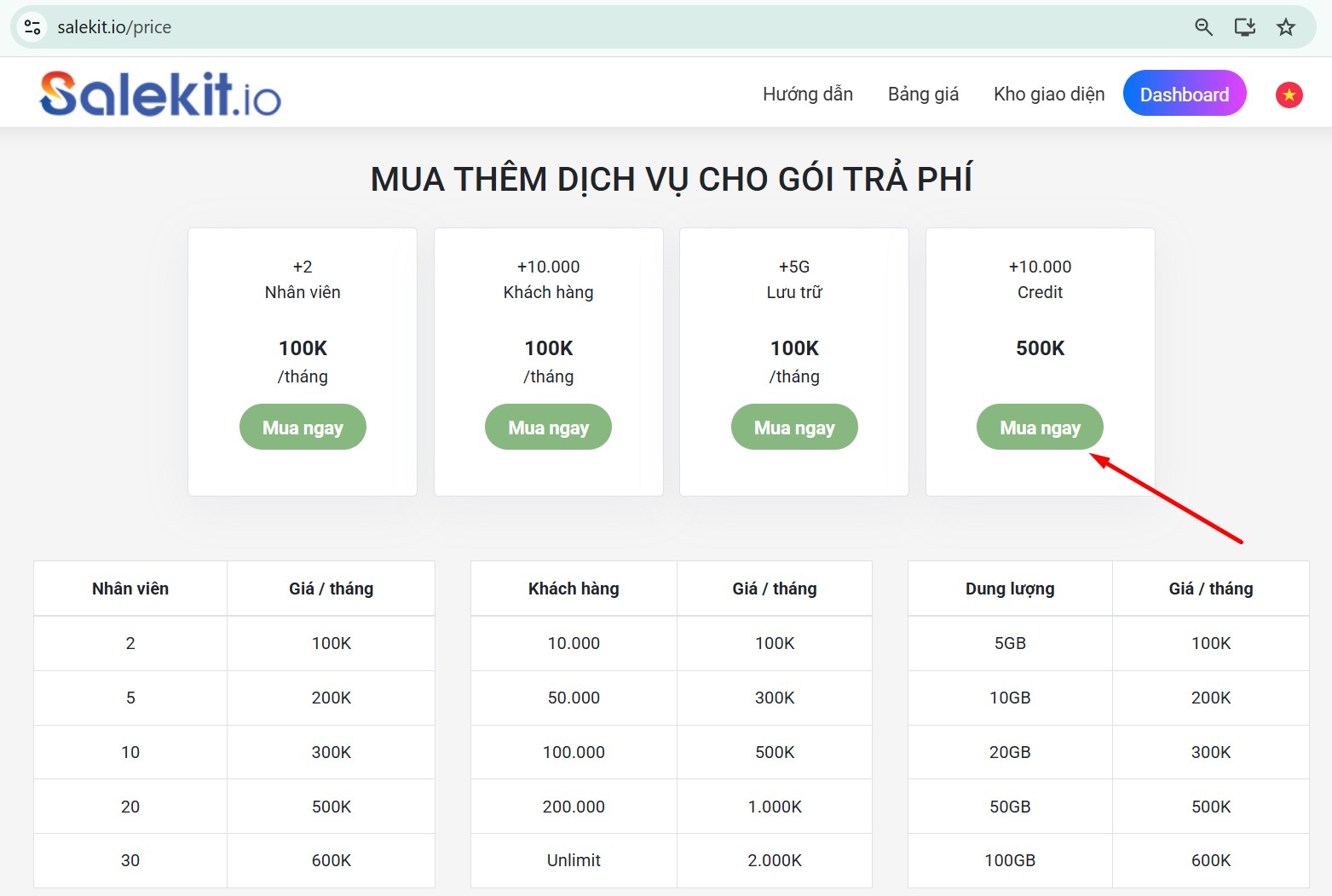 Credit hiện là dịch vụ mua thêm trong các gói trả phí. Như vậy shop cần đăng ký gói trả phí của Salekit.io từ Basic trở lên và truy cập Bảng giá Salekit.io >> kéo xuống mục mua thêm dịch vụ cho gói trả phí >> nhấn Mua ngay tại ô Credit.