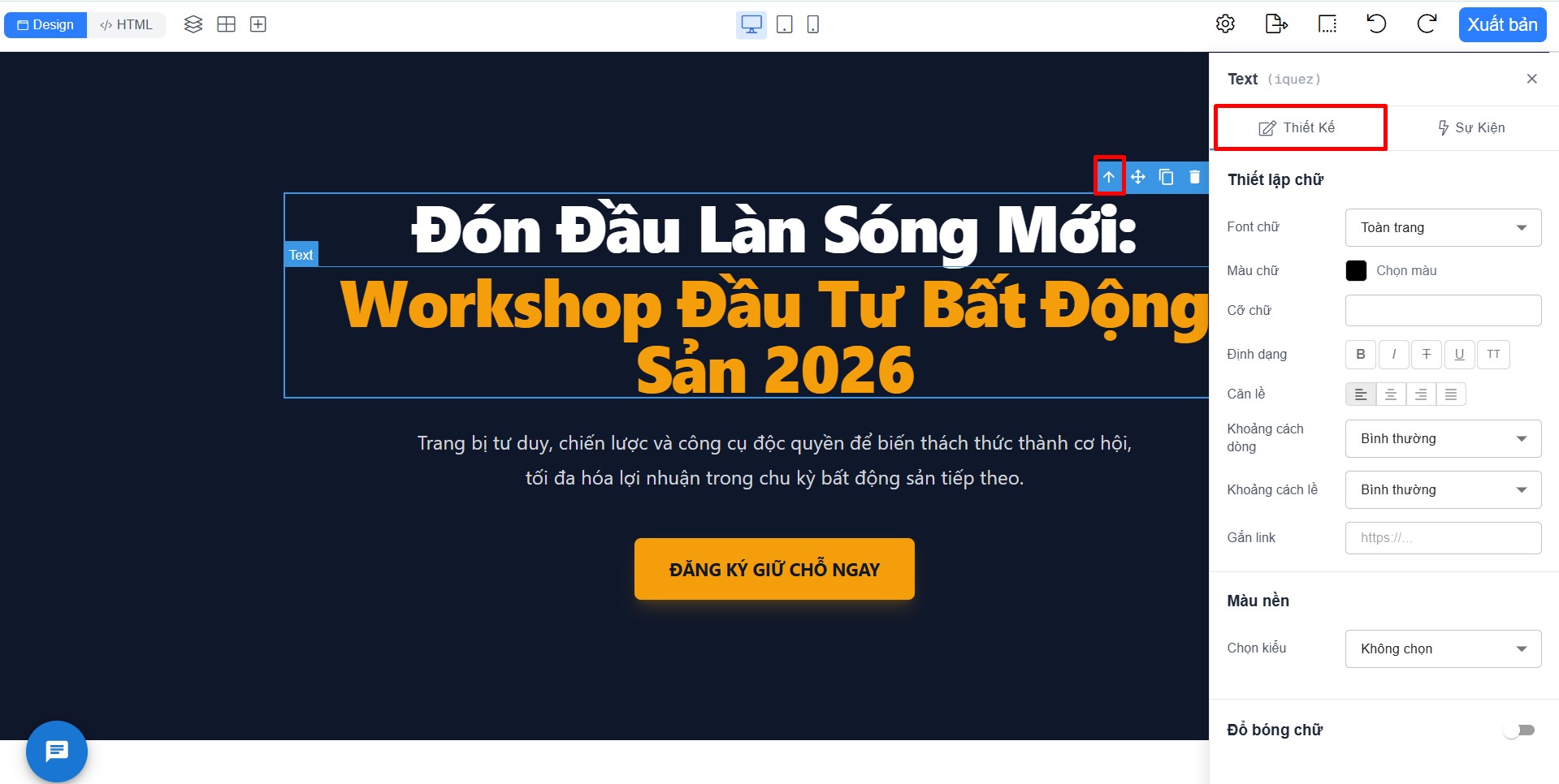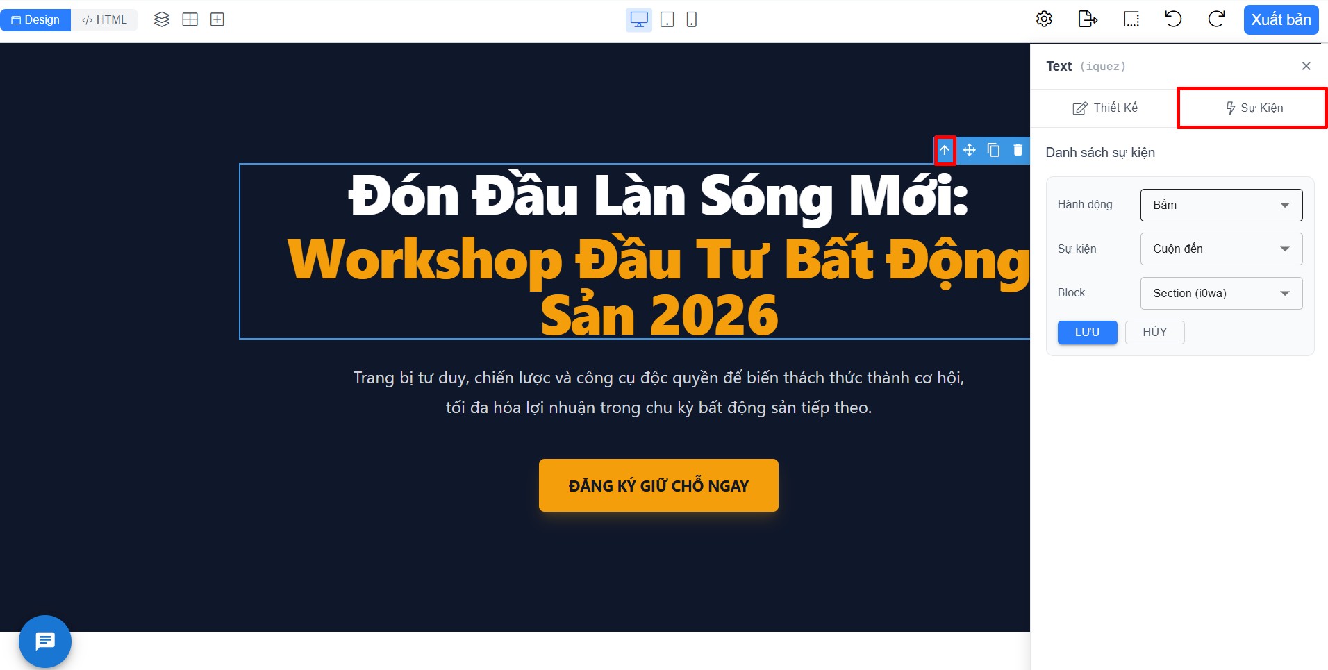 - Xem HTML trang landing page: Bạn chọn </>HTML ở góc trên cùng tay phải màn hình