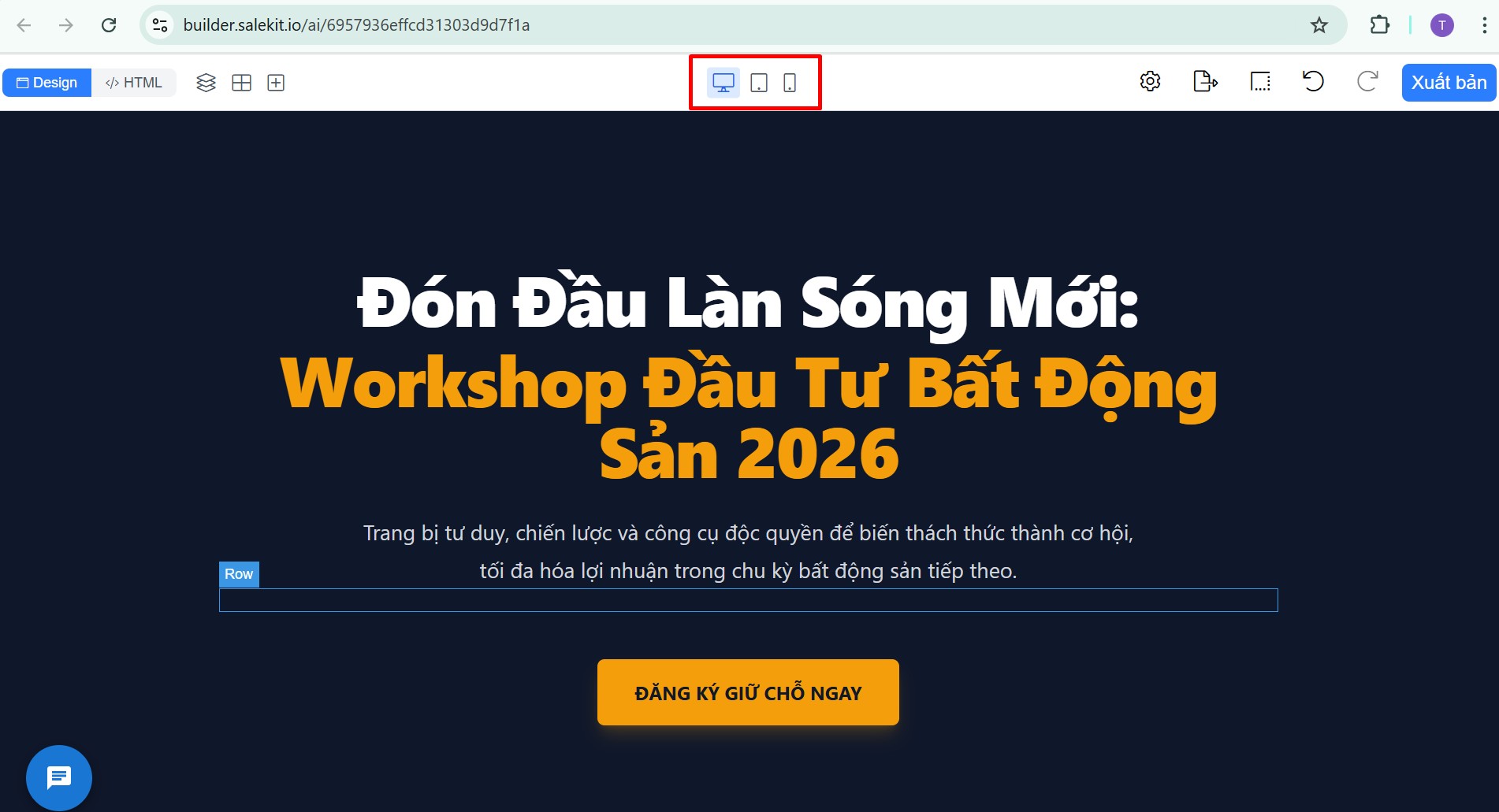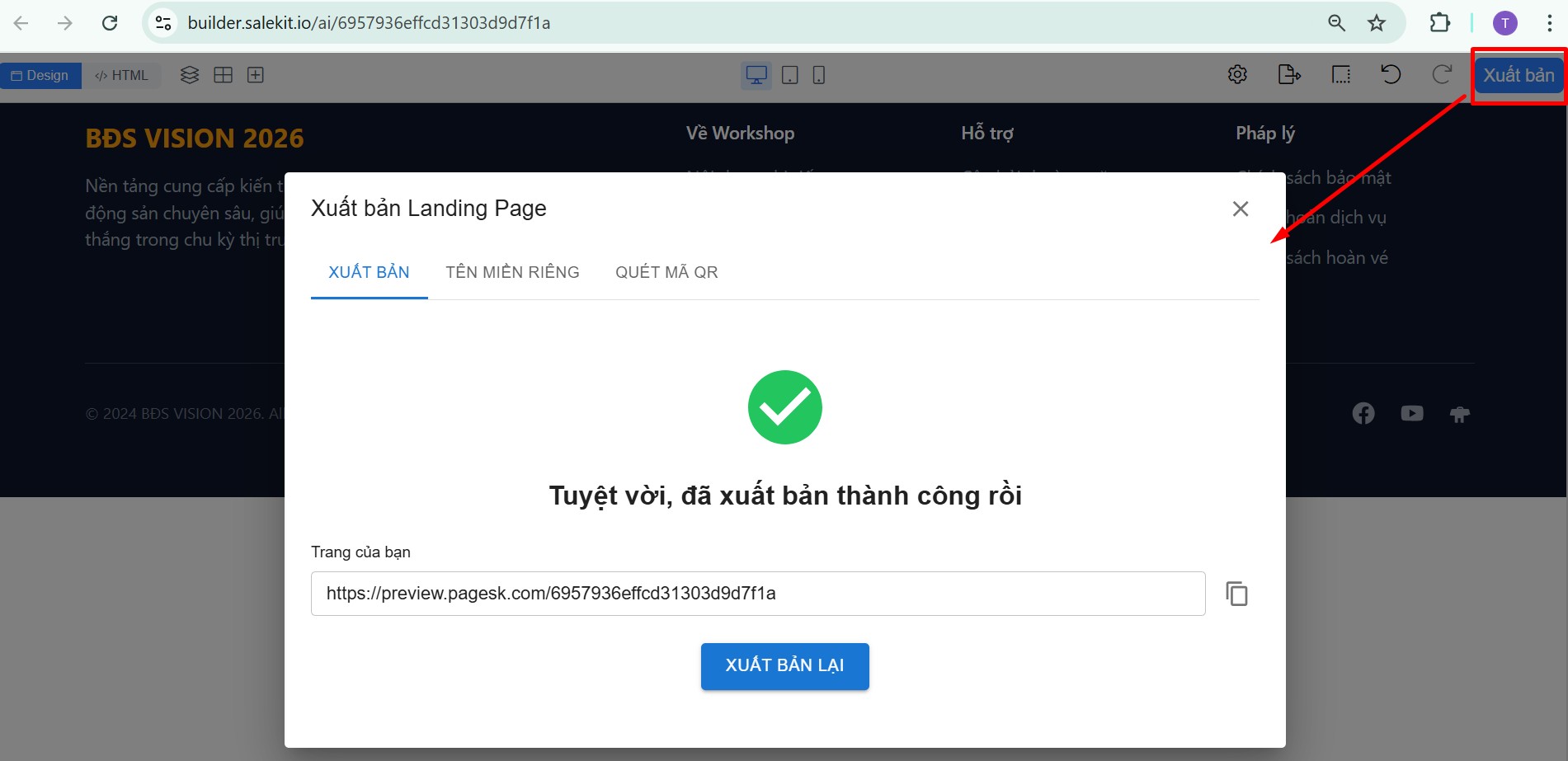 Trong trang chỉnh sửa landing page, bạn chọn nút Xuất bản ở góc trên cùng bên tay phải, hệ thống sẽ xuất bản landing page với tên miền mặc định của salekit và bạn sẽ cần đăng nhập tài khoản salekit để xem nội dung.