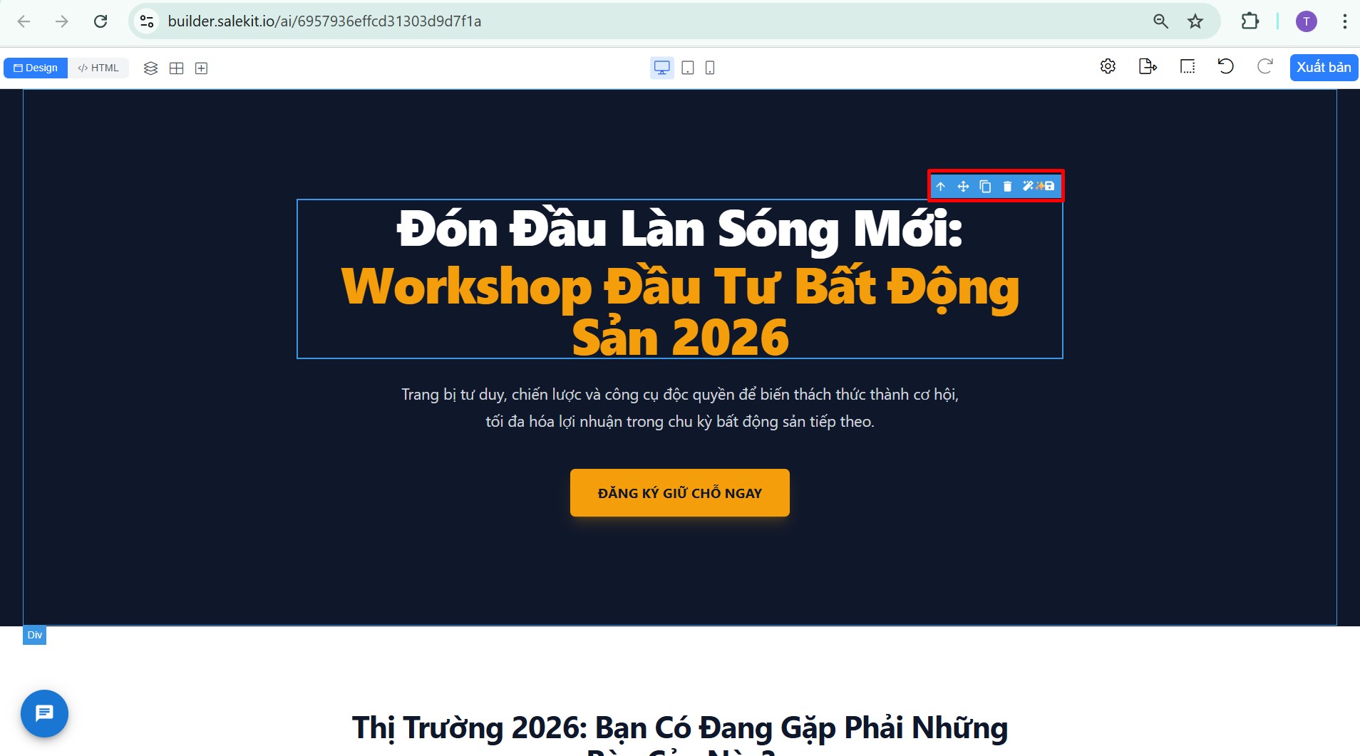 Sau khi AI tạo xong nội dung landing page, bạn có thể chỉnh sửa các khối hoặc đối tượng nội dung để hiển thị đúng mục đích của mình.