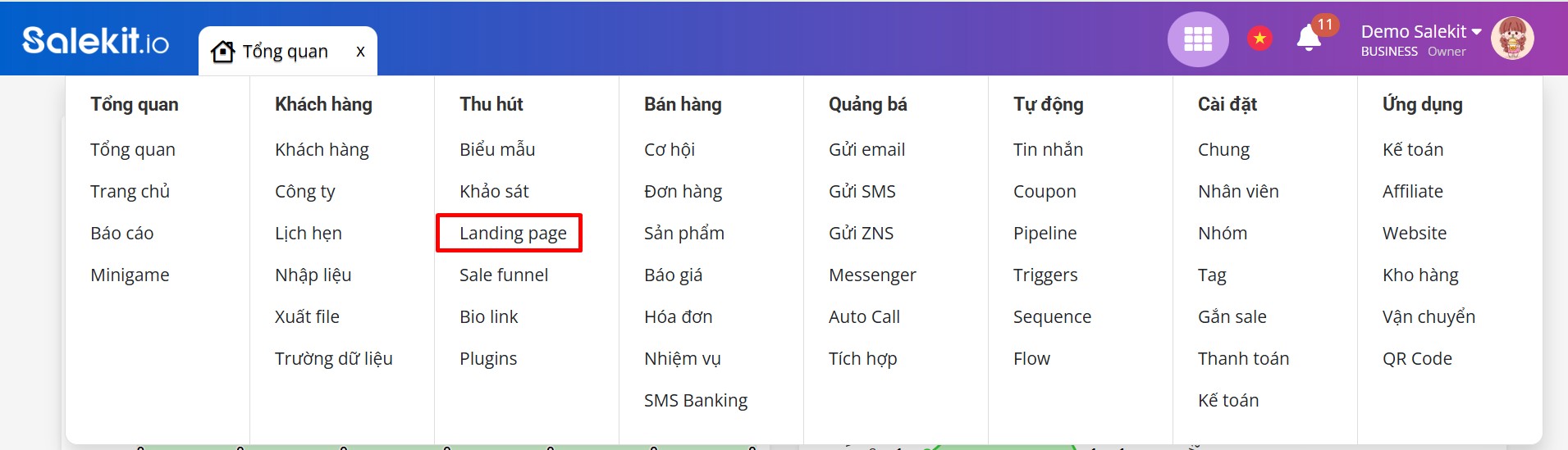 Sau khi mua credit thành công, bạn truy cập shop salekit.io >> chọn Thu hút >> Landing page từ trên thanh menu shop: