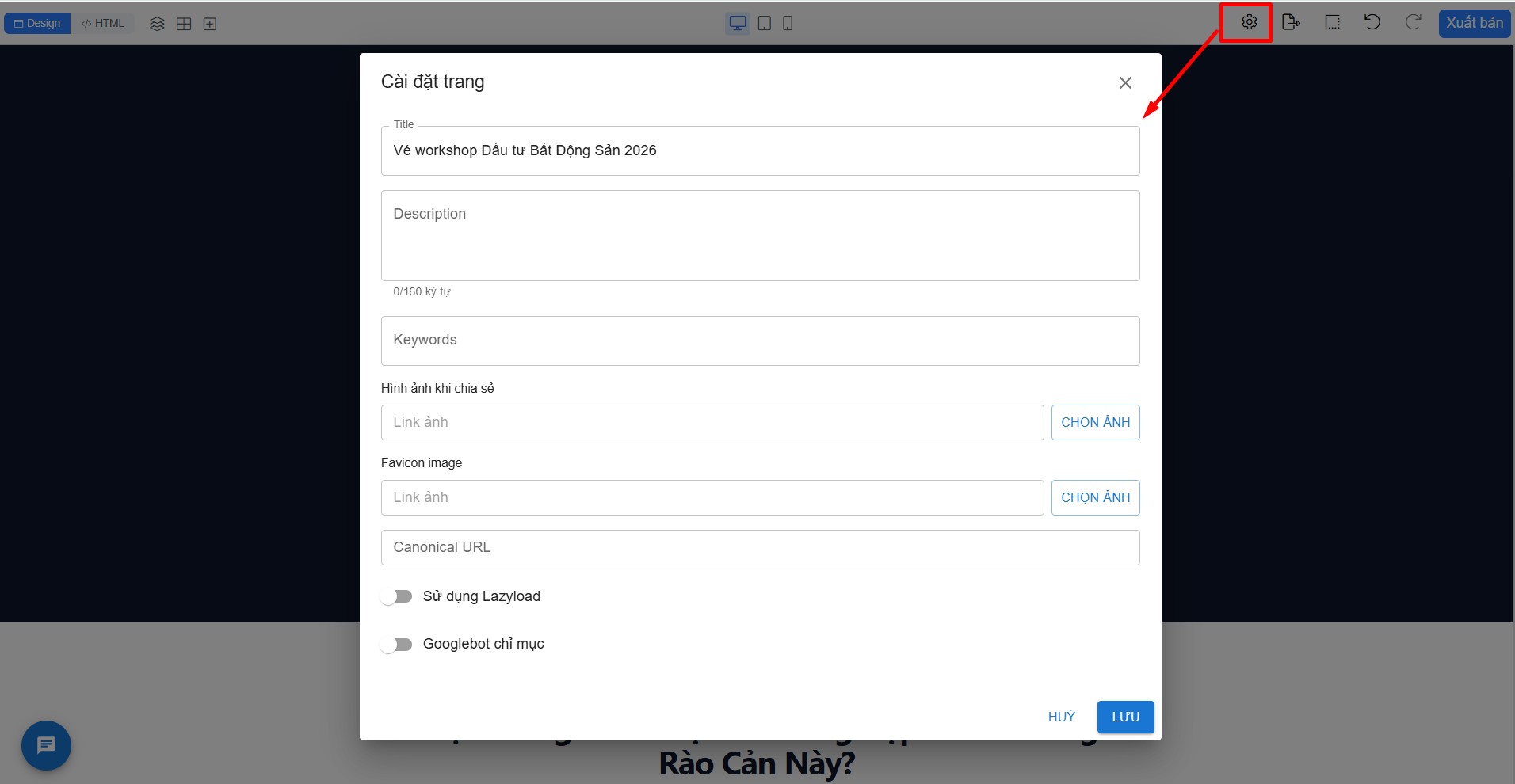 Bạn nhấn vào biểu tượng Cài đặt >> cài các thông tin tiêu đề, ảnh khi chia sẻ, favicon landing page >> Lưu >> Xuất bản lại landing page để cập nhật.