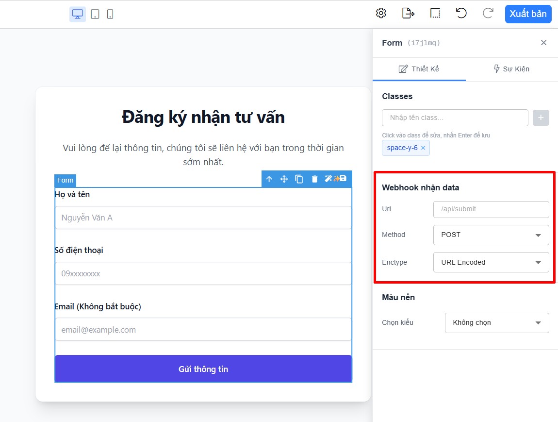 Bạn nhấn vào đối tượng form do AI tạo ra trong landing page, trong mục Cài đặt form >> Thiết kế >> Webhook nhận data điền các thông tin: