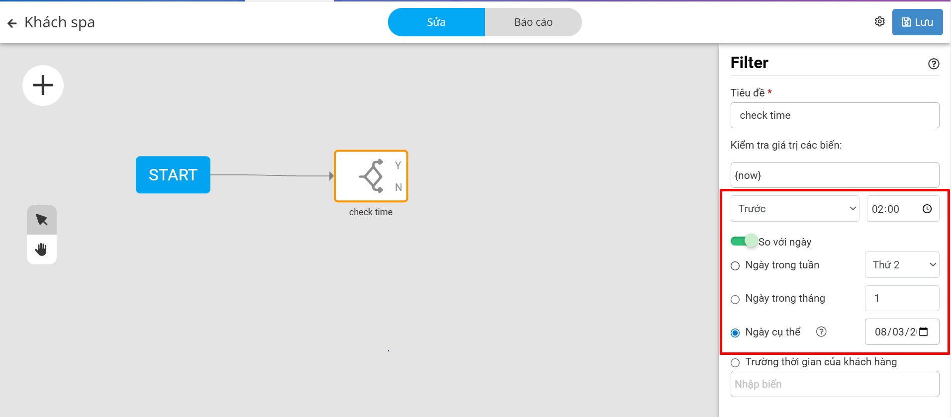 Ví dụ: Cài kiểm tra biến {now} trước 2h so với ngày 08/03, bạn cài như hình: