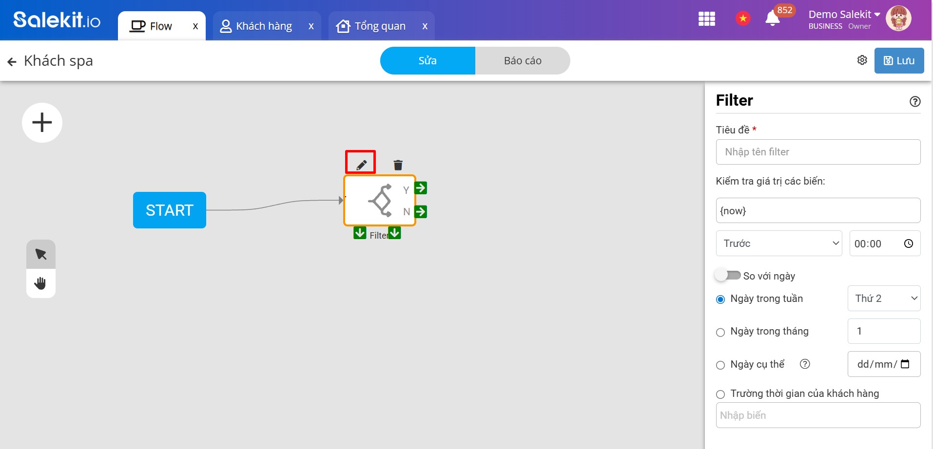 Đặt tên cho đối tượng Filter, Tên này sẽ hiển thị trong chuỗi flow để bạn phân biệt với các đối tượng khác. Đối tượng nào được đặt tên khi lưu lại sẽ có màu đậm
