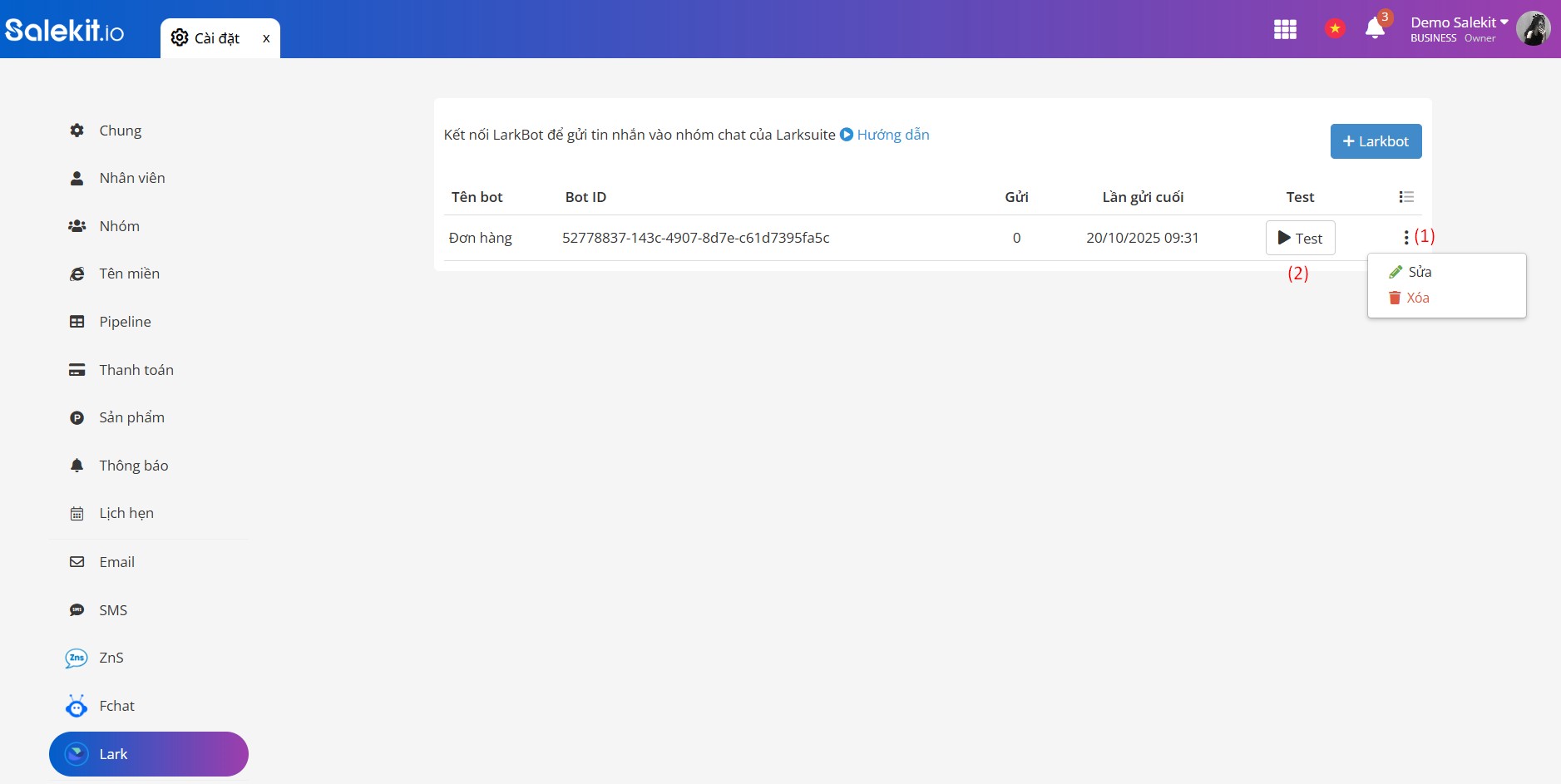 Từ 2 bước trên bạn đã kết nối hoàn tất Bot từ Lark sang Salekit.io