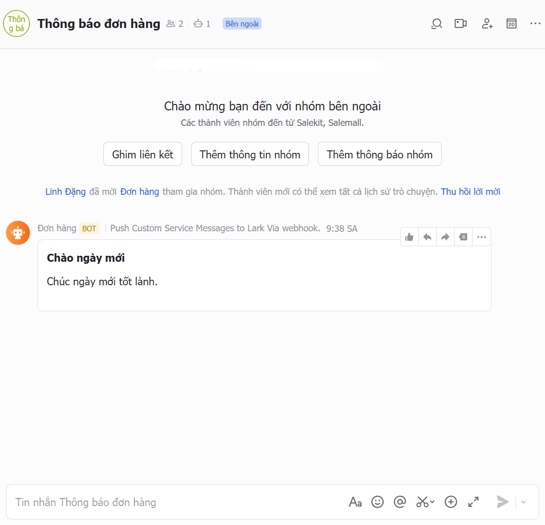 Tin nhắn gửi test thành công sẽ hiện trong nhóm lark: