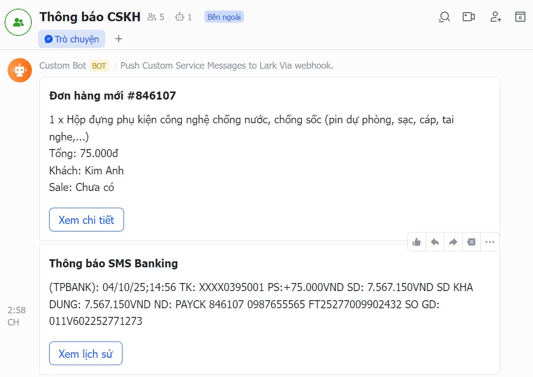Nhóm lark sẽ nhận được tin nhắn khi shop Salekit có đơn hàng mới hoặc tin nhắn sms banking thanh toán đơn hàng thành công. Nội dung bao gồm: