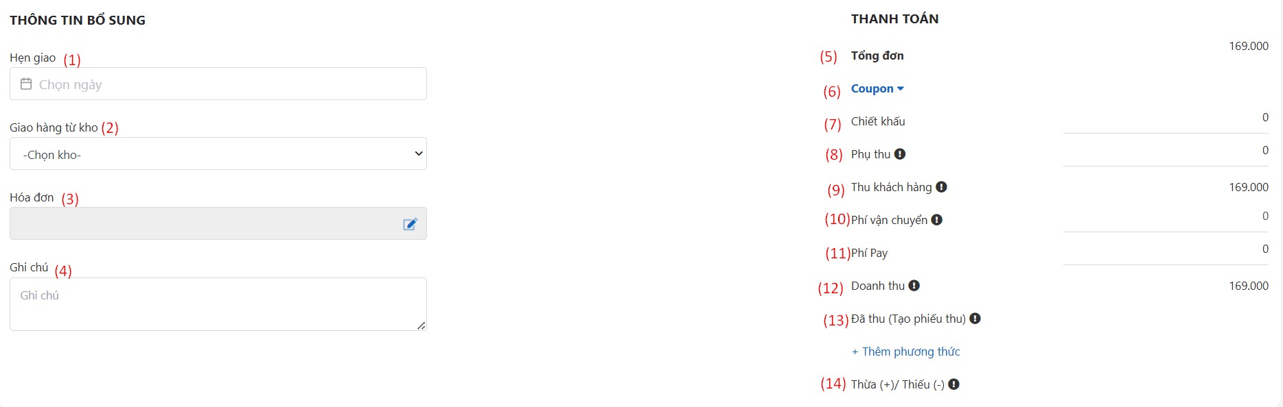 Nếu bạn đã thu tiền trước của khách, bạn chọn +Thêm phương thức >> chọn phương thức >> Điền số tiền đã thu được.