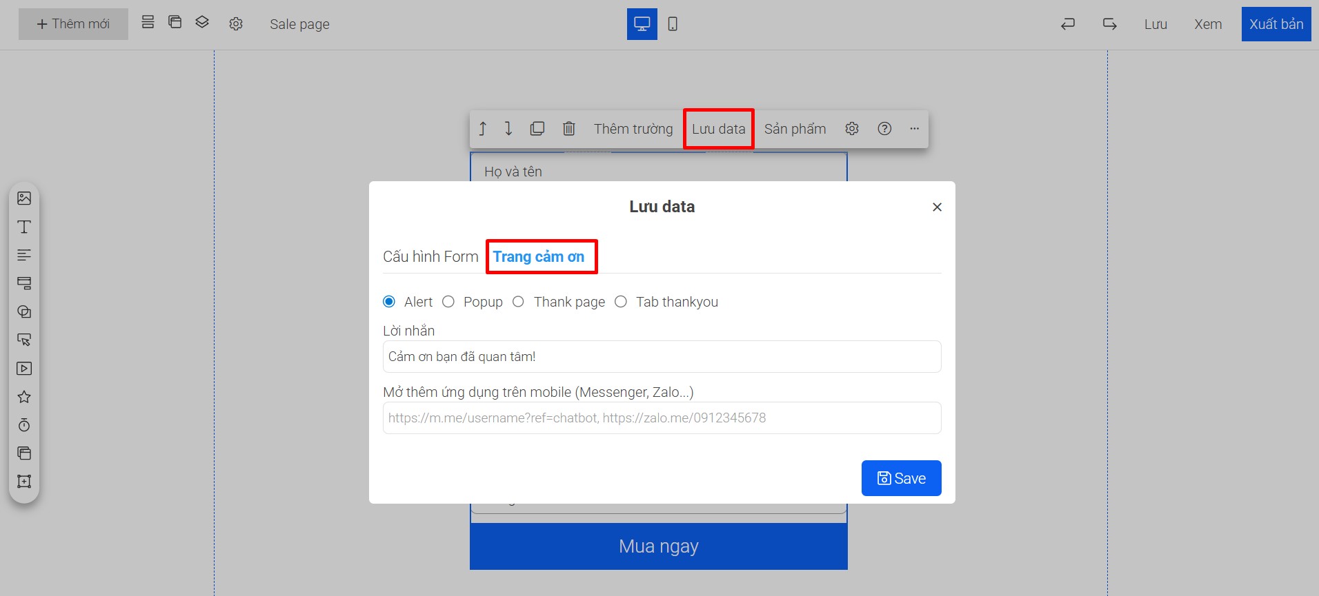 Bạn nhấn vào form >> chọn Lưu data >> trang cảm ơn >> cài đặt trang cảm ơn theo các lựa chọn hiển thị >> Save: