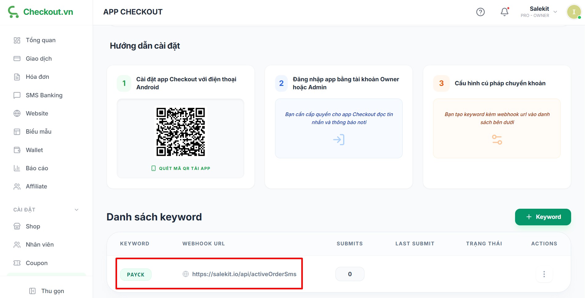 Trên Salekit.io, bạn có thể kết nối với Checkout và cài đặt tính năng SMS Banking để tự động kích hoạt đơn hàng khi khách hàng chuyển khoản thành công.