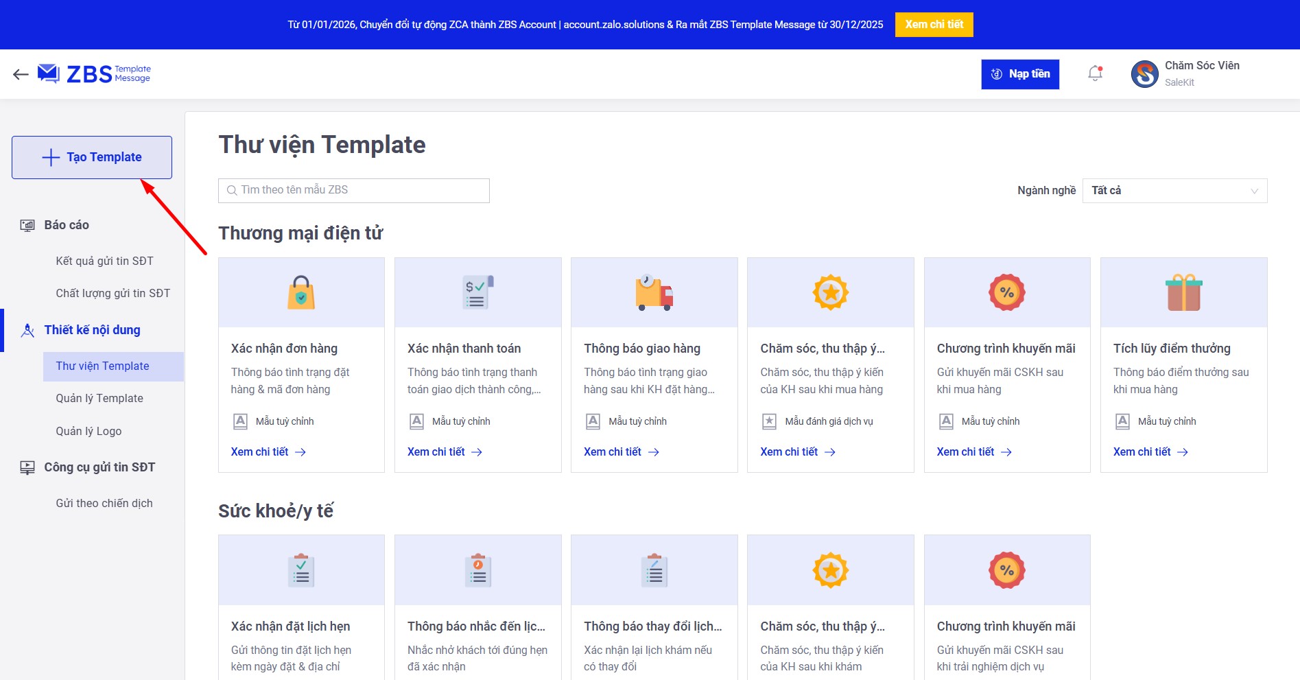 Sau khi được đồng bộ về salekit. Các template được quản lý tại mục Tin nhắn -> ZNS